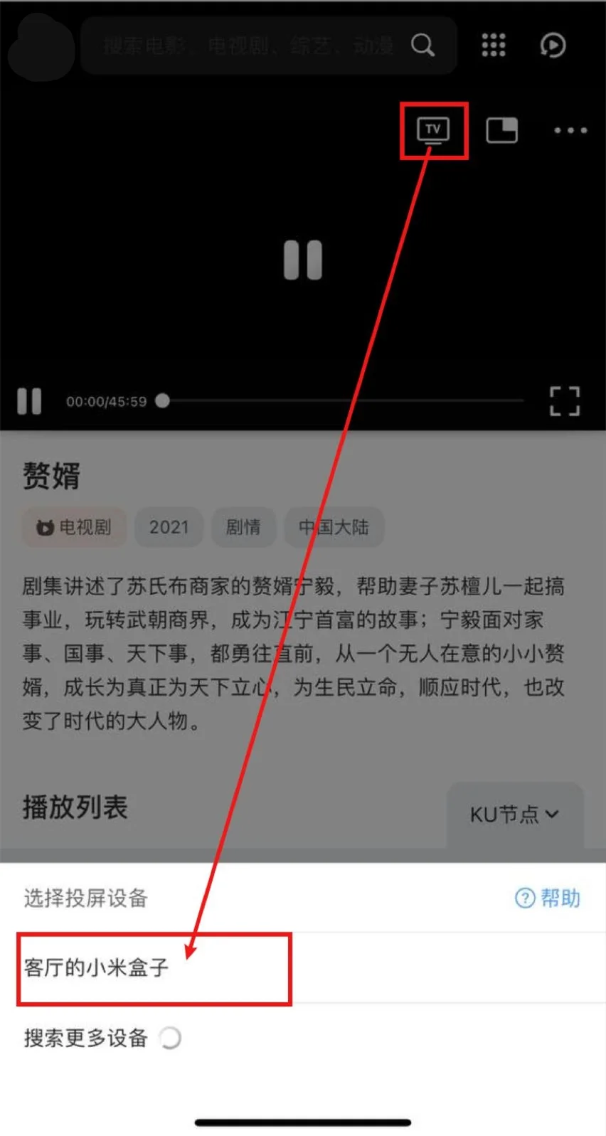 打开QQ浏览器(会接管网页播放器)->打开星火4K | 蓝光原盘->播放视频->选中投屏图标->等待搜寻出智能电视/电视盒子->选中,即可投屏。
